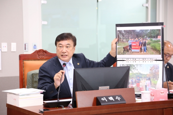 특히 기존 공원시설관리와 관련해 “수입 야자매트는 비쌀 뿐만 아니라 여름철 세균서식과 겨울철 빙판문제가 있고 과도하게 설치할 경우 땅 밟을 접지권을 방해한다”며 “순천시 등 일부 지방자치단체가 불필요한 야자매트 설치를 제한하는 조례를 제정하고 있는 만큼, 경기도민들이 힐링숲 흙길을 밟을 수 있는 권리를 지켜달라”고 당부했다.