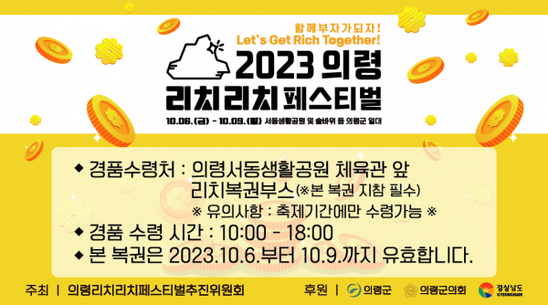 [금요저널] 의령군은 10월 6일~9일 서동생활공원과 솥바위 일원에서 열리는 의령리치리치페스티 기간에 '리치 복권'을 지급하는 특별 이벤트를 진행한다고 12일 밝혔다.