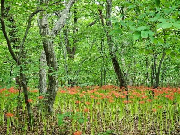 상림공원의 꽃무릇은 진녹색의 활엽수와 어우러져 마치 숲속에 불이 난 듯 붉게 피어나고 있다.