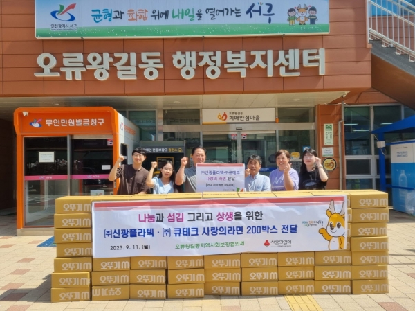 [금요저널] 인천 서구 오류동 검단산업단지에 위치한 ㈜신광플라텍과 ㈜큐테크는 지난 11일 추석 명절을 맞이해, 관내 어려운 이웃들을 위해 라면 200박스를 오류왕길동행정복지센터에 기부했다.