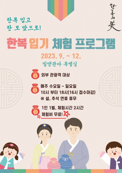 시 관계자는 “밀양을 찾은 관광객에게 한복 문화를 향유할 기회를 제공하기 위해 한복입기 체험 프로그램을 추진하게 됐다”며 “앞으로 밀양만의 특색있는 관광 콘텐츠 개발을 통해 관광매력도시로서의 품격과 가치를 다채롭게 펼쳐 나가겠다”고 전했다.