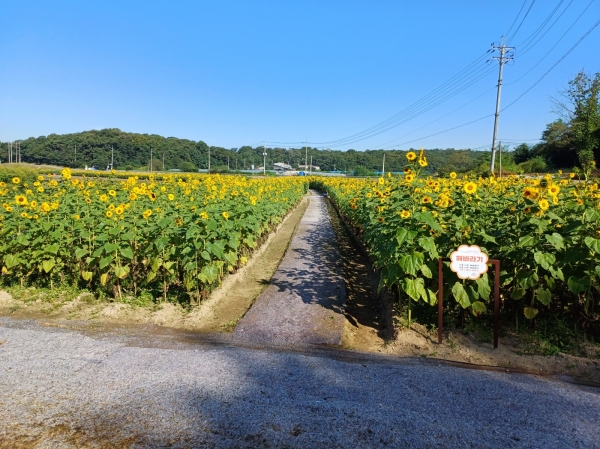 은현면 행정복지센터와 지역주민들은 신천이 마주 보이는 약 2,000평 규모의 휴경지에 해바라기씨를 뿌려 꽃밭을 가꿔왔다.