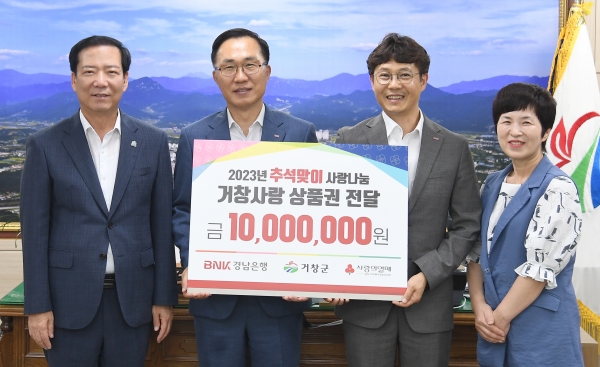 BNK경남은행 거창지점은 매년 설·추석 명절마다 거창군에 거창사랑상품권을 기부해 왔으며 여름과 겨울에는 선풍기와 이불 등을 꾸준히 기부해 지역사회를 위한 따뜻한 나눔에 앞장서고 있다.