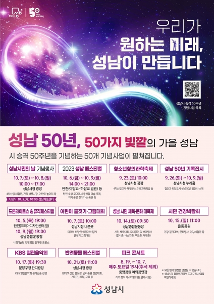 이를 위해 ‘성남 50년, 50가지 빛깔의 가을 성남’을 기치로 내건 시민참여 행사 등 50개 기념사업을 마련했다.
