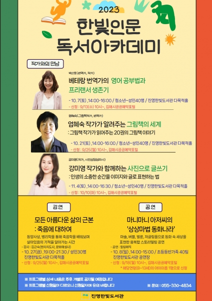 [금요저널] 김해시 진영한빛도서관은 10월 7일부터 11월 4일까지 작가와의 만남, 강연, 공연 등 다양한 인문독서프로그램을 만나볼 수 있는 2023 한빛인문독서아카데미 행사를 운영한다.
