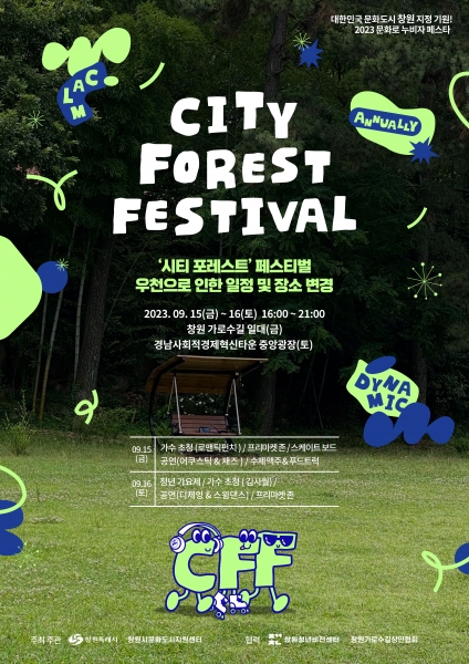 [금요저널] 창원특례시와 창원시문화도시지원센터는 오는 9. 15.부터 9. 16. 2일간, 창원 가로수길 일대에서 개최되는 ‘문화로 누비자 페스타-CITY FOREST FESTIVAL’이 기상청의 비 예보에 따라 축제의 일부를 변경 운행한다고 밝혔다.