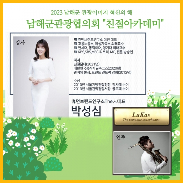 [금요저널] 남해군 관광협의회가 ‘2023년 남해군 관광이미지 혁신의 해’를 맞아 오는 9월20일 남해마늘연구소에서 ‘친절아카데미’를 개최한다.