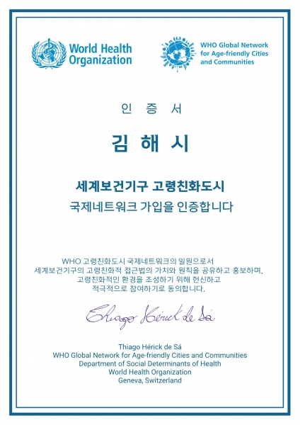홍태용 시장은 “고령친화도시 네트워크 가입으로 김해시가 여성·아동·고령 3대 친화도시가 됐다”며 “나이드는 것이 불편하지 않은 도시, 모든 세대가 살고 싶은 도시가 될 수 있도록 국제적인 표준에 맞는 김해형 고령친화도시 조성에 최선을 다하겠다”고 밝혔다.
