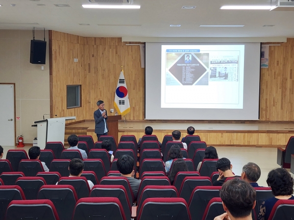 [금요저널] 하대동 주민자치위원회는 13일 김주완 작가를 초청해 한국폴리텍대학 진주캠퍼스 창의공학관 드림홀에서 감성과 자극을 먹는‘감자인문학’제6강을 개최했다.