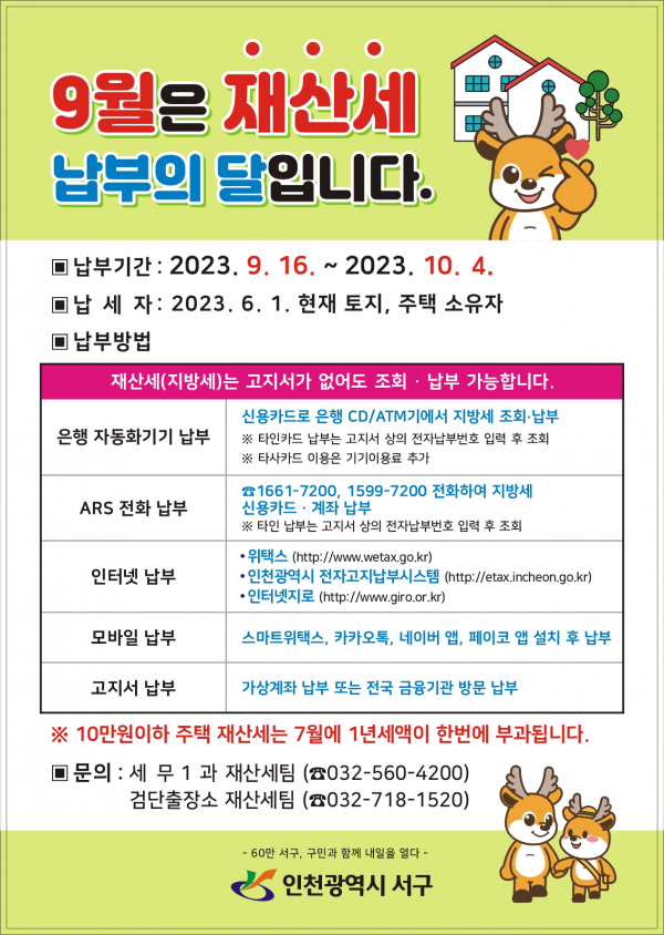 재산세는 고지서 없이 ATM기기에 본인 통장이나 카드를 넣으면 재산세를 조회해 바로 납부할 수 있으며 가상 계좌이체, 위택스·인터넷지로 ARS 카드납부 등 다양한 방법으로 납부 가능하다.