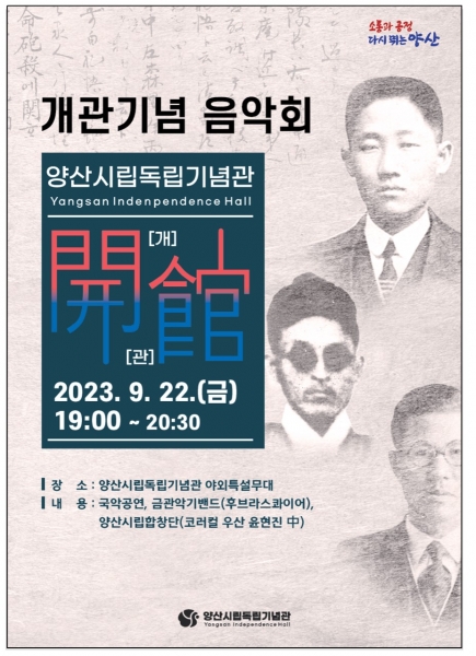 [금요저널] 양산시립독립기념관은 오는 22일 오후 7시 기념관 앞 특설무대에서 개관 기념음악회를 개최한다고 밝혔다.
