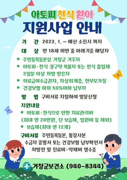 사업대상자는 거창군에 주소를 둔 만 18세 미만 아토피·천식 환아 중 의료급여수급권자, 한부모가정, 건강보험 하위 50% 이하 납부자이다.