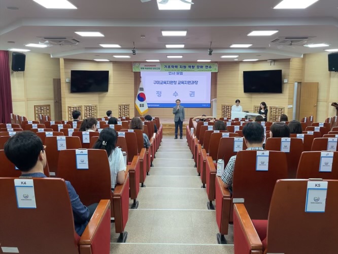 □ 경상북도 구미교육지원청 기초학력거점지원센터는 14일 (구미, 김천) 중등 학습지원 담당교원를 대상으로 기초학력 역량강화 연수를 실시했다. 구미기초학력거점지원센터는 학습지원대상학생의 개별 맞춤형 학습코칭과 더불어 정서·행동 발달 문제를 지닌 학생을 대상으로 치료 지원을 하고, 교사 및 학부모 대상 연수와 상담 등을 종합적으로 지원하고 있다.