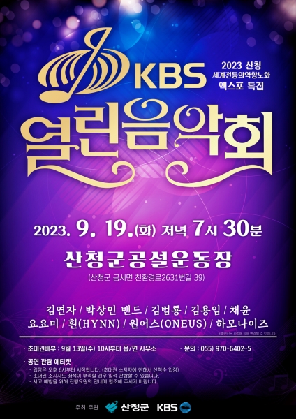 오는 19일 산청군공설운동장에서 열리는 이번 음악회는 세대와 음악적 취향이 다른 지역민과 관광객들이 함께 어우러져 즐길 수 있는 무대가 펼쳐진다.