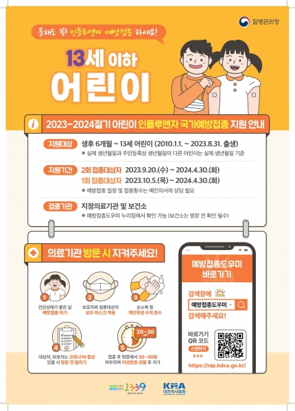 오는 9월 20일부터 실시하는 어린이 2회 접종 대상자는 생후 6개월부터 만 9세 미만 중 생후 처음인 경우, 2023년 6월까지 인플루엔자 백신을 1회만 접종한 경우, 이전 접종력을 모르는 경우가 해당되는 어린이 대상이다.