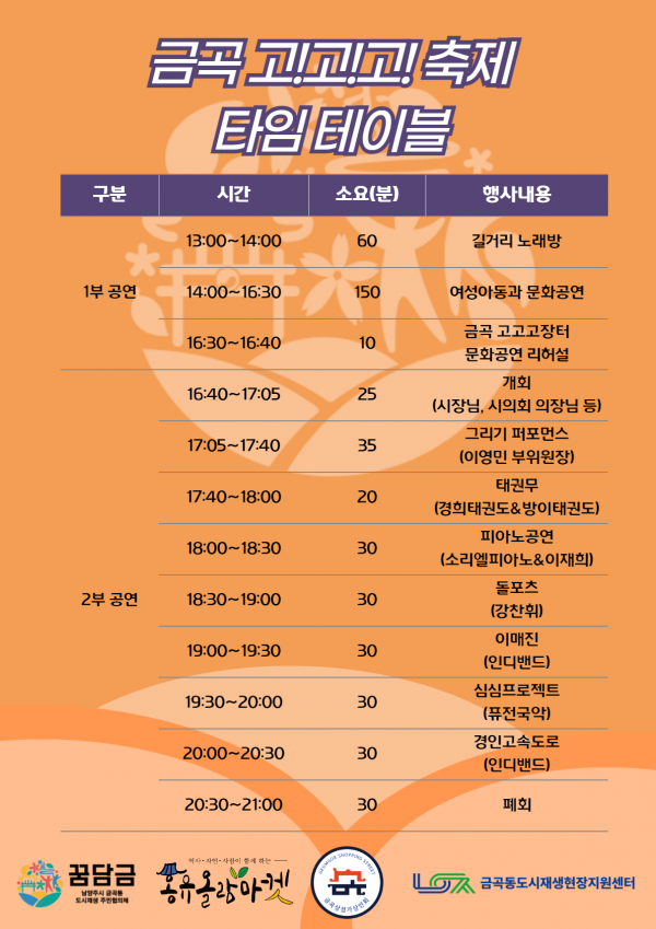 행사에 관한 자세한 내용은 남양주시 금곡동 도시재생현장지원센터 공식 블로그에서 확인할 수 있으며 행사 당일 오전 6시부터 오후 11시까지 금곡로 일부 구간 차량 및 버스 통행이 제한된다.