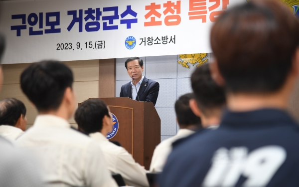 [금요저널] 구인모 거창군수는 15일 거창소방서 대강당에서 신규 임용자를 포함한 소방공무원 100여명을 대상으로 특강을 했다.