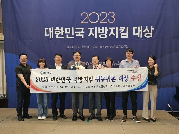 [금요저널] 의령군이 14일 한국프레스센터 20층 프레스클럽에서 열린 '2023 대한민국 지방지킴 대상'에서 귀농·귀촌 부문 대상을 수상했다.