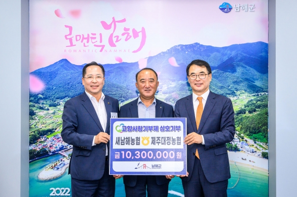제주대정농협 임직원이 남해군에 1030만원을 기부했고 새남해농협 임직원은 제주도에 700만원을 기부했다.