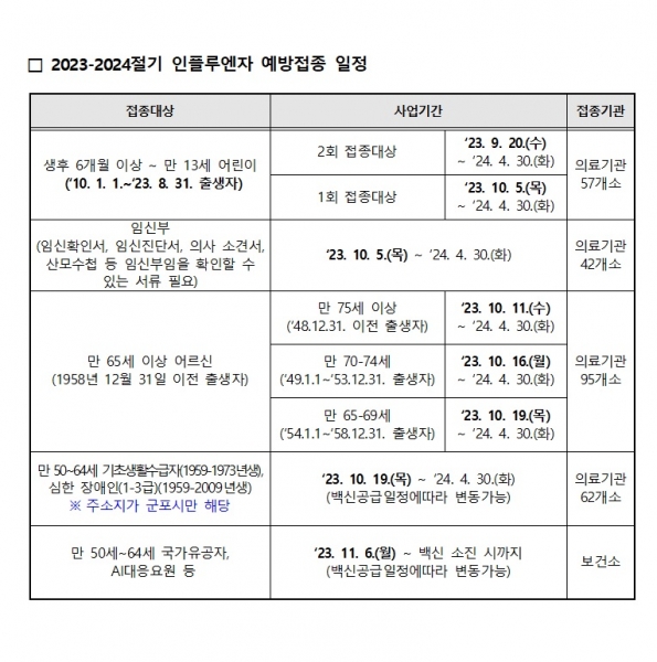 예방접종은 생후 6개월 이상~만 13세 이하 어린이, 임신부, 만 65세 이상 고령자, 취약계층을 대상으로 9월 20일부터 시작되며 별도 예약 없이 위탁의료기관으로 지정된 동네 병·의원에서 무료로 이뤄진다.