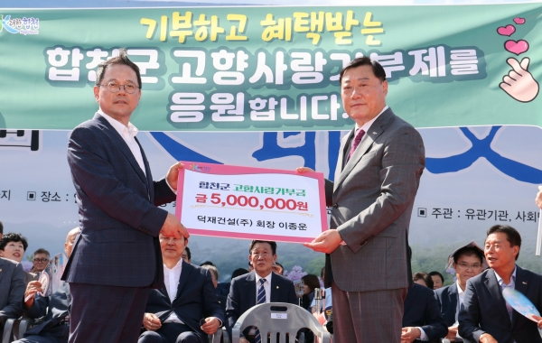 덕재건설㈜ 이종운 회장은 “고향사랑기부제 참여로 고향인 합천군 발전에 도움이 된 것 같아 기쁘다”며 “다른 출향인분들도 합천군 고향사랑기부제에 동참해 고향 사랑을 이어나가기를 바란다”고 전했다.