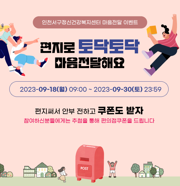 [금요저널] 인천 서구는 자살 예방의 날 및 정신건강의 날을 기념해 오는 18일부터 이달 말일까지 소중한 이들에게 위로와 응원의 마음을 보내는 ‘토닥토닥 마음 전달해요’ 캠페인을 진행한다고 밝혔다.