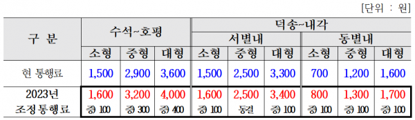 통행료 조정은 민간투자법과 실시협약에 따라 소비자물가지수 변동분을 반영해 정기적으로 조정한 사항으로 최근 급격한 물가상승에 따라 통행료 인상 요인이 발생하면서 통행료 조정이 불가피한 실정이다.