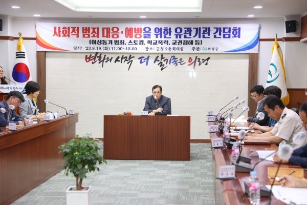 [금요저널] 의령군은 19일 군청 2층 회의실에서 최근 심각한 문제로 떠오른 이상 동기 범죄, 스토킹, 학교폭력, 교권 침해 등 사회적 범죄 예방을 위해 지역 실정에 맞는 대책을 수립하고 군민 안전 위협에 공동으로 대응하고자 의령교육청·경찰서·소방서 등과 함께 머리를 맞댔다.