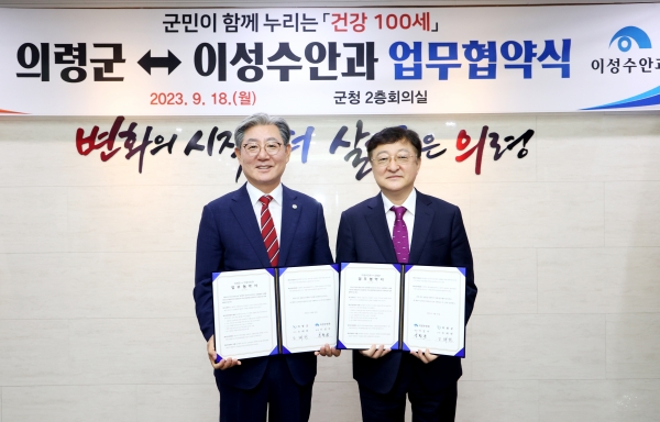 [금요저널] 의령군은 18일 군청 2층 회의실에서 이성수 안과와 업무협약을 체결했다고 밝혔다.