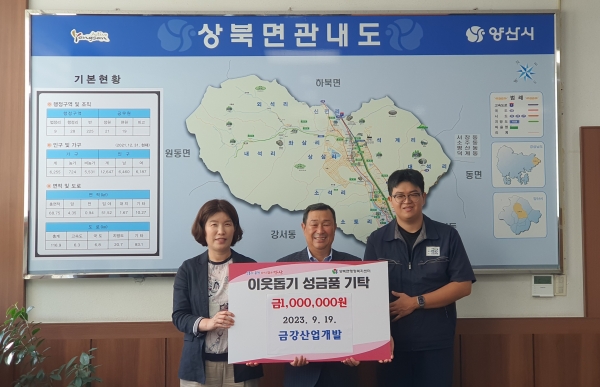 [금요저널] 양산시 상북면에 소재한 ㈜금강산업개발이 지난 19일 추석 명절을 앞두고 어려운 이웃을 돕기 위한 후원금 100만원을 상북면행정복지센터에 기탁했다.