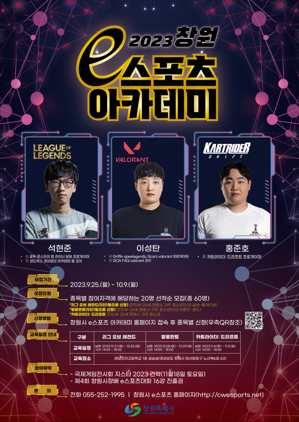 수강 신청은 10월 9일 자정까지 창원시 e스포츠 홈페이지와 SNS 채널, 포스터 내 QR 코드 등을 통해 온라인 접수 받는다.