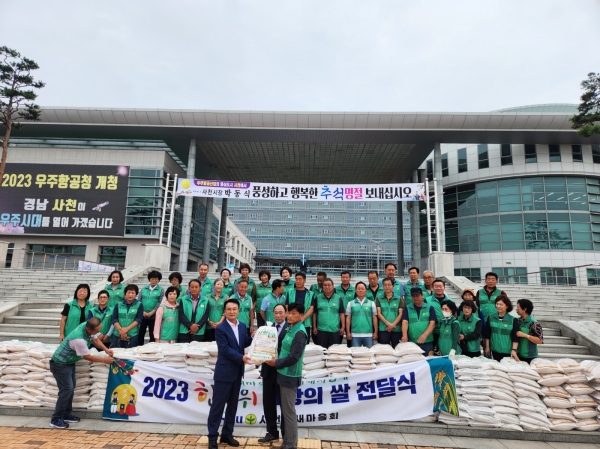 [금요저널] 사천시새마을회는 20일 오전 사천시청 노을광장에서 민족 고유의 명절 추석을 맞이해 어려운 이웃을 위한 ‘한가위 사랑의 쌀 전달식’을 가졌다.
