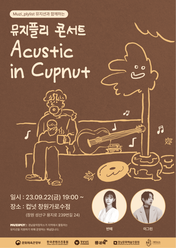 ‘뮤지플리’는 경남음악창작소 뮤지시스의 플레이리스트라는 의미임 도내 스트리밍 매장 중 하나인 컵넛에서 진행되는 이번 공연은 지역에서 꾸준히 활동 중인 싱어송라이터 반떼와 공감과 위로를 나누는 뮤지션 이그린이 가을밤 어쿠스틱 무대를 선보인다.
