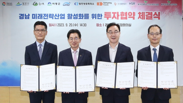 [금요저널] 경남도와 하동군, 광양만권경제자유구역청은 20일 ㈜엘앤에프와 경남도 도정회의실에서 하승철 하동군수, 김병규 경제부지사, 송상락 광양만권경제자유구역청장, 최수안 ㈜엘앤에프 대표이사가 참석한 가운데 광양만권경제자유구역 하동지구 대송산업단지에 이차전지 소재 양산 공장 신·증설 투자에 대한 투자협약서를 체결했다고 밝혔다.