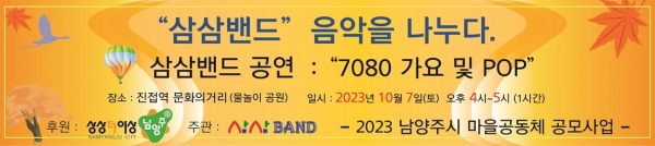[금요저널] 남양주시는 마을공동체‘삼삼밴드’가 오는 10월 7일 진접역 문화의 거리에서 7080가요 및 팝음악 공연을 개최한다고 밝혔다.