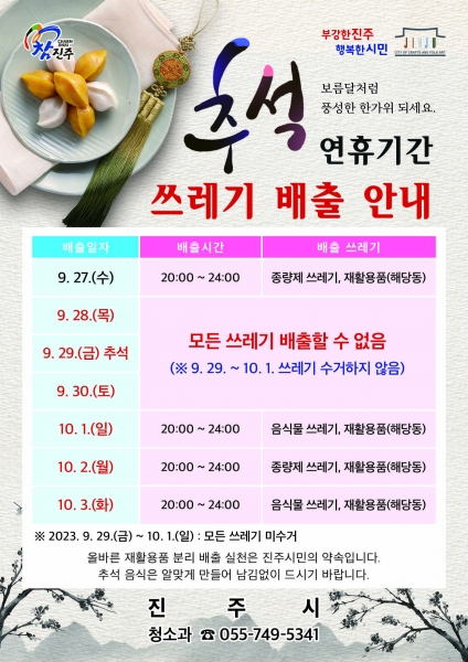 [금요저널] 진주시는 민족 최대의 명절인 추석을 맞아 시민들이 깨끗하고 쾌적한 분위기 속에서 즐거운 추석 명절을 보낼 수 있도록 추석 연휴 쓰레기 특별관리 대책을 수립해 추진한다.