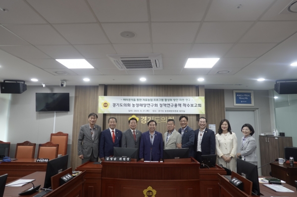 [금요저널] 경기도의회 농정해양연구회는 21일 농정해양위원회 회의실에서 ‘메타분석을 통한 경기도 치유농업 프로그램 활성화 방안 연구’를 주제로 정책연구용역 착수보고회를 개최했다.