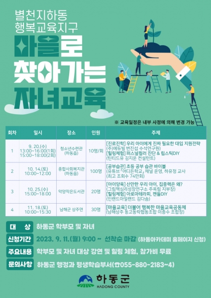 회차별 프로그램은 하동아카데미를 통해 선착순으로 접수하며 그 외 자세한 사항은 군청 행정과 평생학습담담부서로 문의하면 된다.