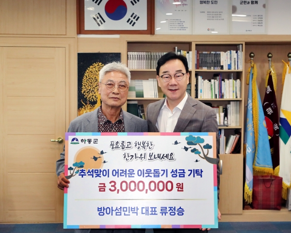 [금요저널] 하동군은 진교면 술상마을 앞 방아섬에서 민박을 운영하는 류정승 씨가 추석 명절을 앞둔 지난 21일 군수실을 찾아 성금 300만원을 기탁했다고 22일 밝혔다.