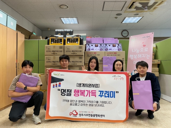 또한, 양주1동의 장OO님은 “경제적 어려움으로 이번 명절에는 시댁, 본가 등 아무 곳도 방문하지 않기로 했었다 경제적으로 힘든 시기에 행복센터의 깜짝 방문 및 선물에 너무 고맙고 아이와도 명절 동안 잘 지낼 수 있게 됐다”며 감사 소감을 전했다.