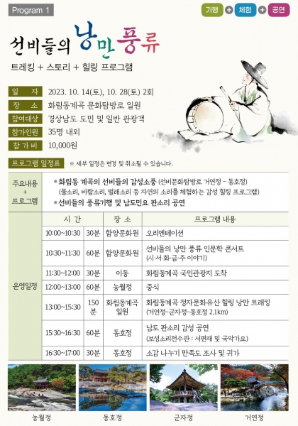 ‘선비들의 낭만풍류 프로그램’은 성인을 대상으로 화림동계곡의 감성소풍과 남도민요 판소리 공연 등이 메인프로그램으로 자리 잡고 있으며 ‘선비들의 리더십 인문학 콘서트‘는 우리지역 중·고등학생 및 청소년을 대상으로 기획된 우리지역의 선비정신과 리더십을 주제로 한 인문학 콘서트와 천연염색체험, 함양문화유적지 기행을 실시하고 화림동계곡 동호정에서남도판소리 감성공연을 경험하게 되는 매우수준 높은 문화콘텐츠 프로그램이다.