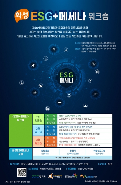 화성‘ESG+메세나’ 워크숍은 ‘2023 경기 문화자치 활성화 사업’의 일환으로 기업과 예술의 파트너십을 통해 시민의 삶과 지역사회의 발전을 이루고자 하는 사업이다.