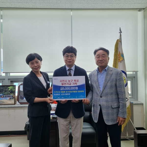 [금요저널] 경상국립대학교 의과대학 이동훈 교수가 25일 사천시 농구 발전을 위해 사용해 달라며 사천시체육회에 500만원의 발전기금을 기탁했다.
