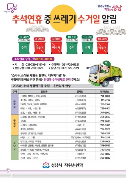 성남시, “추석 연휴 중 쓰레기 수거일 기억하세요”