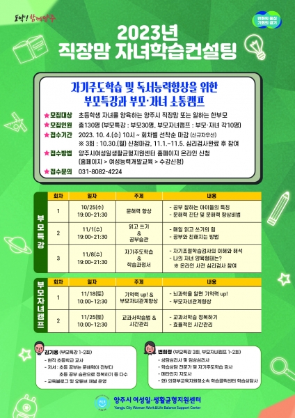 [금요저널] 양주시여성일·생활균형지원센터는 다음달 4일부터 자녀학습의 정보와 기회의 격차로 고민하는 직장맘을 대상으로 ‘직장맘 자녀학습컨설팅’ 참여자를 모집한다.