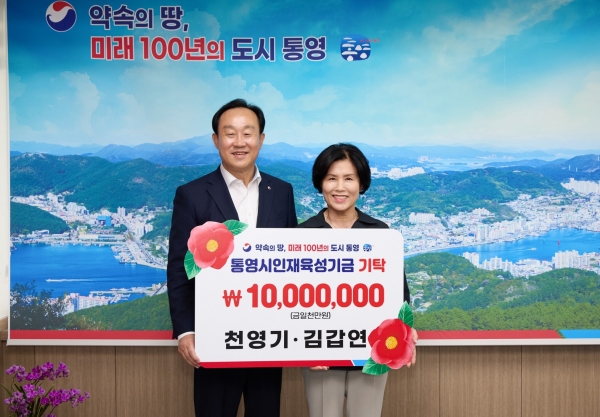 [금요저널] 천영기 통영시장은 지난 25일 부인 김갑연 여사와 함께 시장 집무실에서 통영시 인재육성기금 1천만원을 기탁했다.