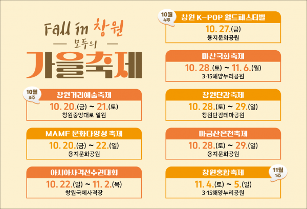 10월 넷째 주부터는 ‘마산 국화축제’와 ‘마금산 온천축제’, ‘창원단감축제’, 11월 첫째 주에는 ‘창원 홍합 축제’가 열린다.