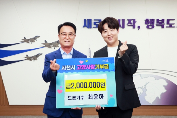 사천시 출신 트로트 가수 최윤하는 26일 오후 자신의 고향인 사천시청을 방문해 고향사랑기부금 200만원을 박동식 시장에 전달하면서 사천시 고향사랑기부제 20호 고액 기부자로 등극했다.