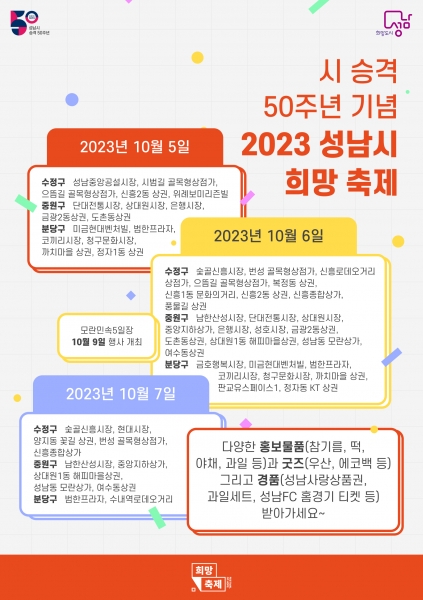[금요저널] 성남시는 오는 10월 5일부터 7일까지 3일간 성남시 주요 전통시장과 상점가에서 ‘2023 성남시 희망 축제’를 개최한다.