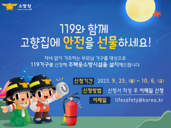 더불어 소방청은 추석 연휴를 맞아 고향에 거주하는 부모님을 소방관이 직접 방문해 주택화재경보기를 설치하고 안부를 묻는 캠페인을 진행한다.